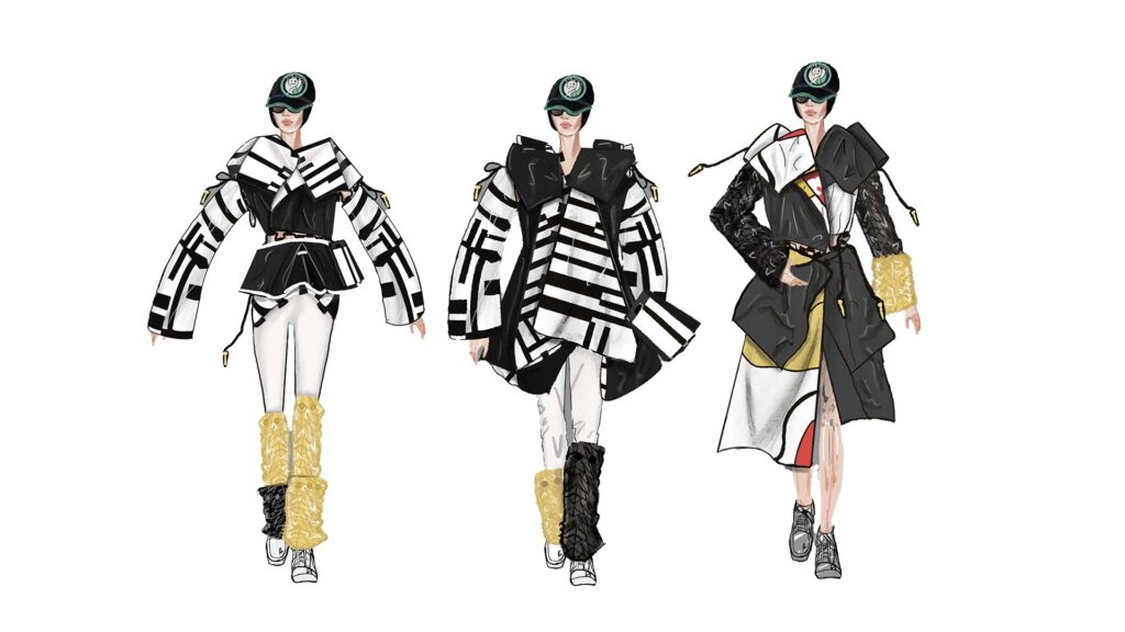 Anli’s Redress Design Award collection, ‘Disappearing Space’, draws inspiration from the disappearance of spaces worldwide due to pollution, extreme weather, and rising sea levels. Her collection repurposes discarded materials into origami-inspired and modular designs, using zero-waste patterns to avoid offcuts. Creating three-dimensional geometric spaces on the human body inspired by architecture, she uses sample yardage fabric and incorporates longevity by allowing transformation, replacement, and various configurations through Lego-like separation and connection with loops and ropes.
