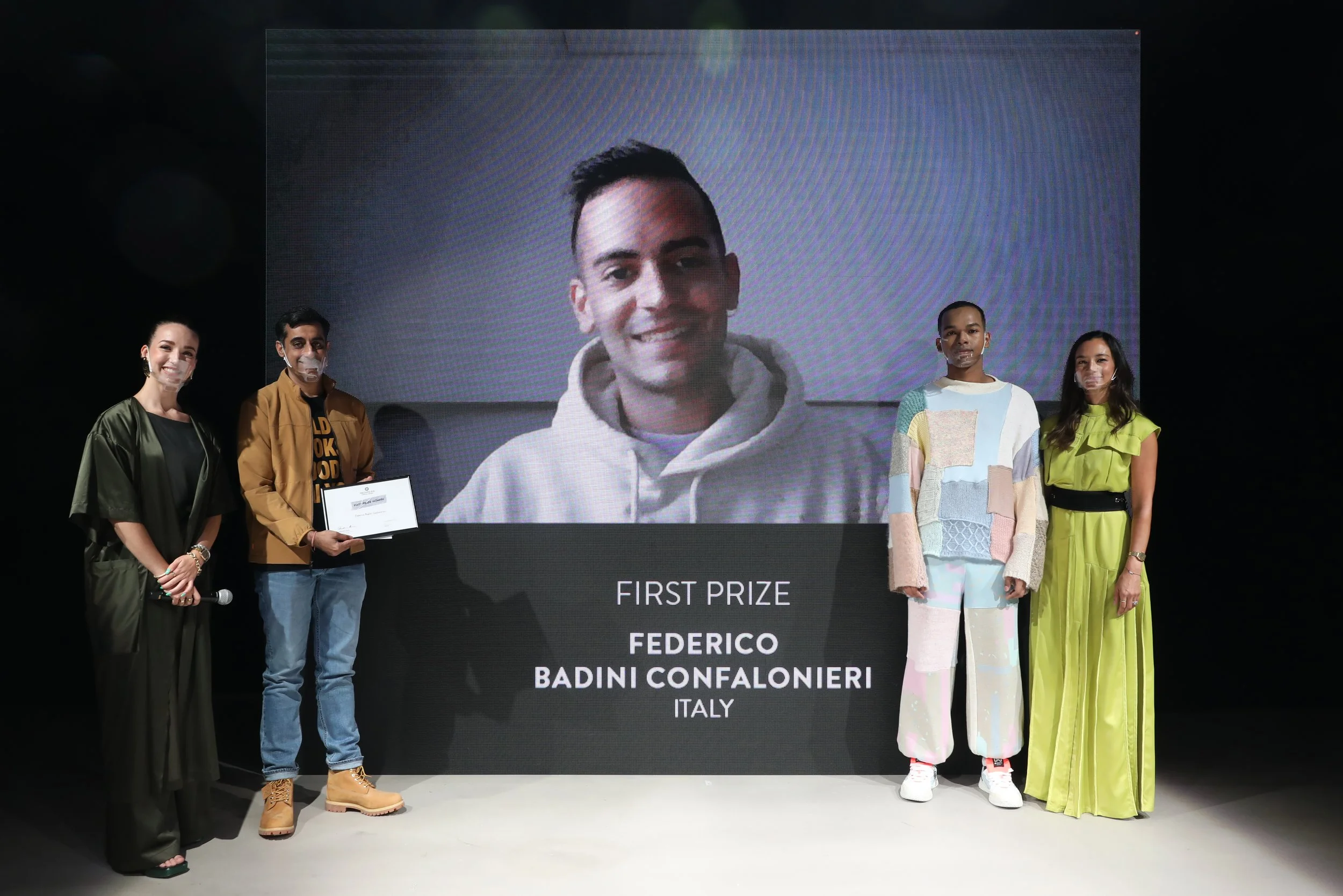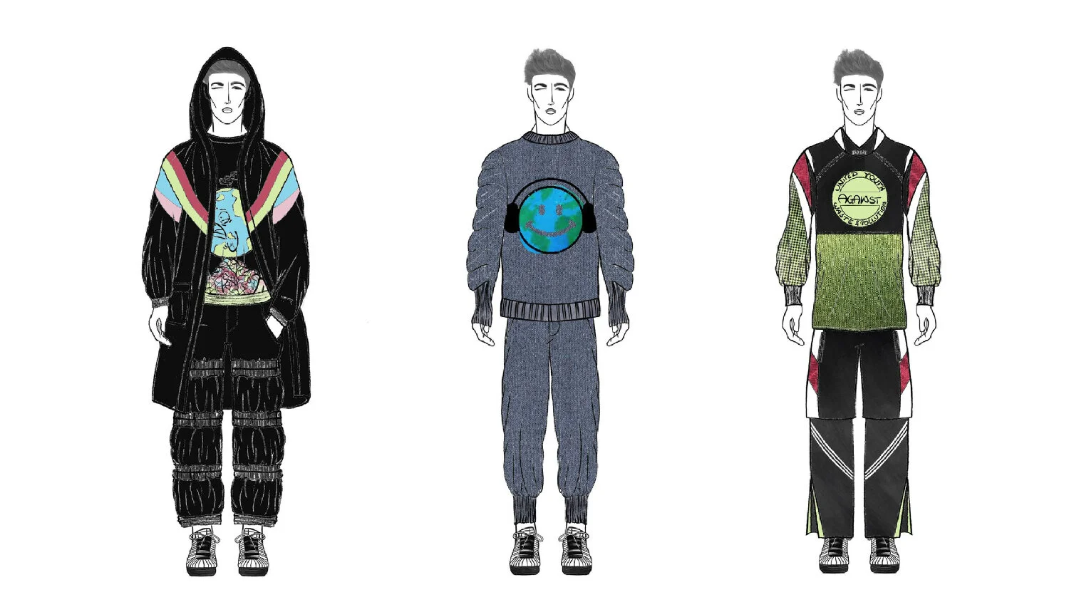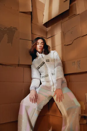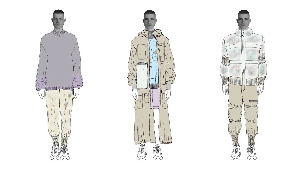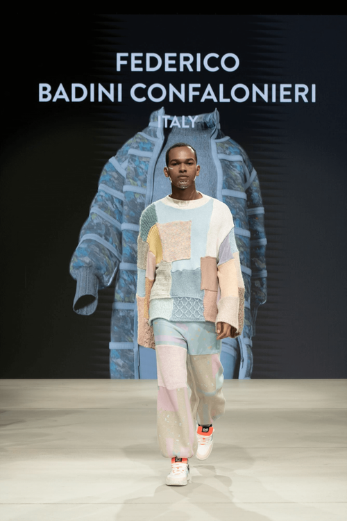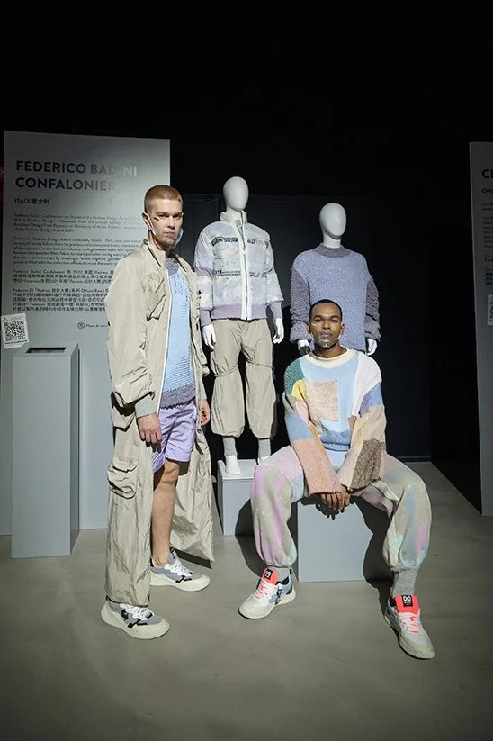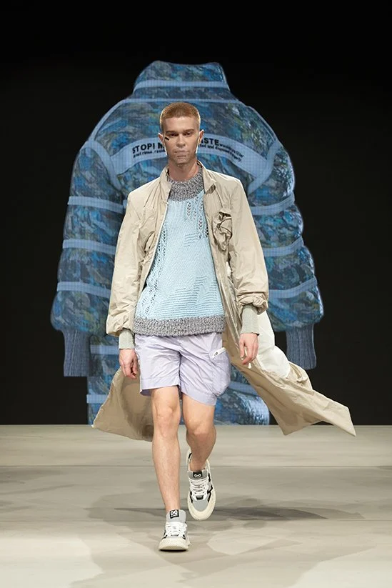 Federico’s Redress Design Award collection, ‘Micro – Rain’, uses zero-waste techniques to upcycle waste fabrics from his previous collections, and draws attention to the problem of microplastics in the fashion industry, with garments made with synthetic fabrics that have an incorporated filter fabric to retain pollution during washing. Federico challenges the zero-waste concept by creating a “waste negative” garment: the zero-waste puffer jacket is filled with the collection of offcuts to reuse the waste created by other garments.