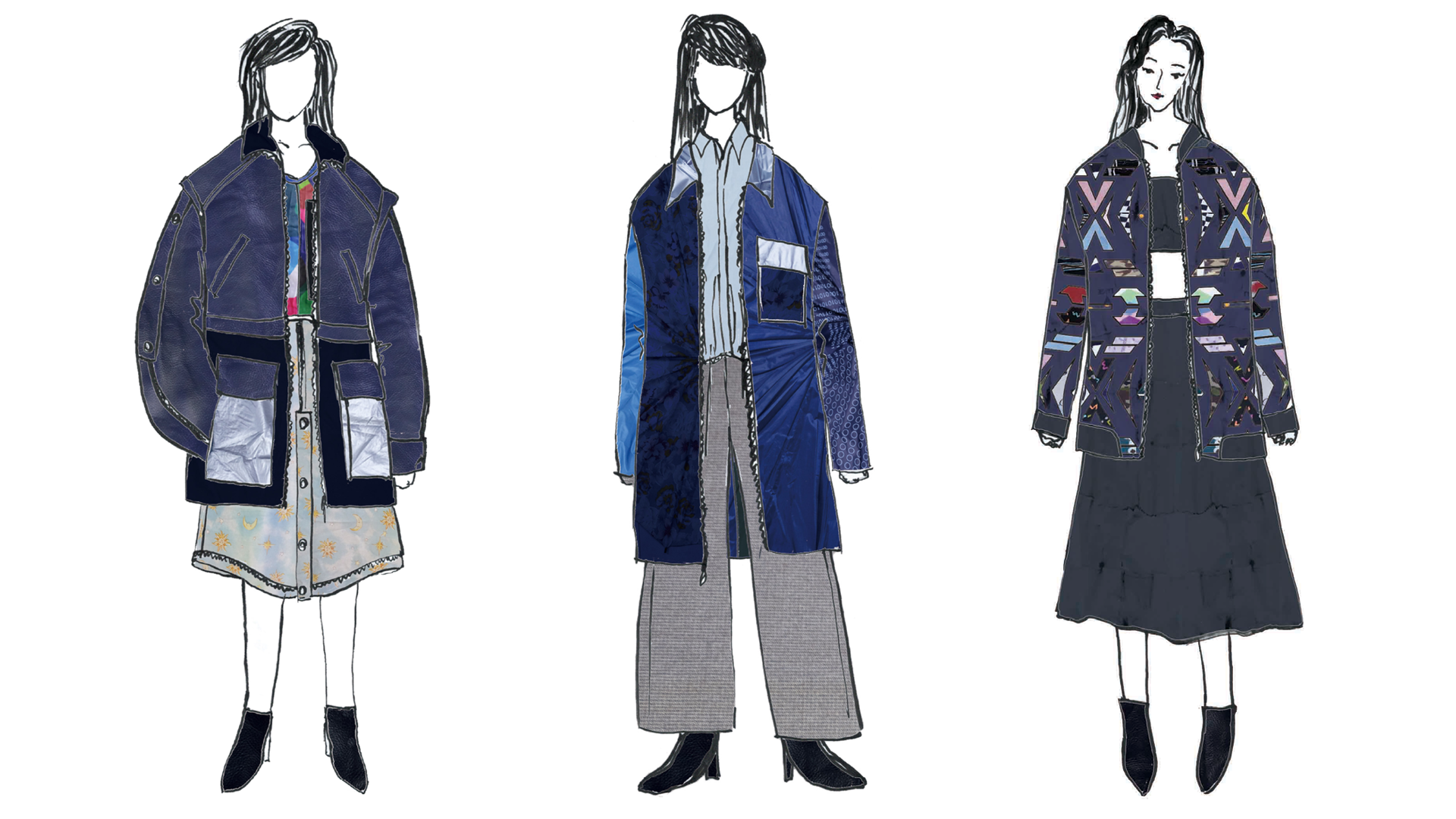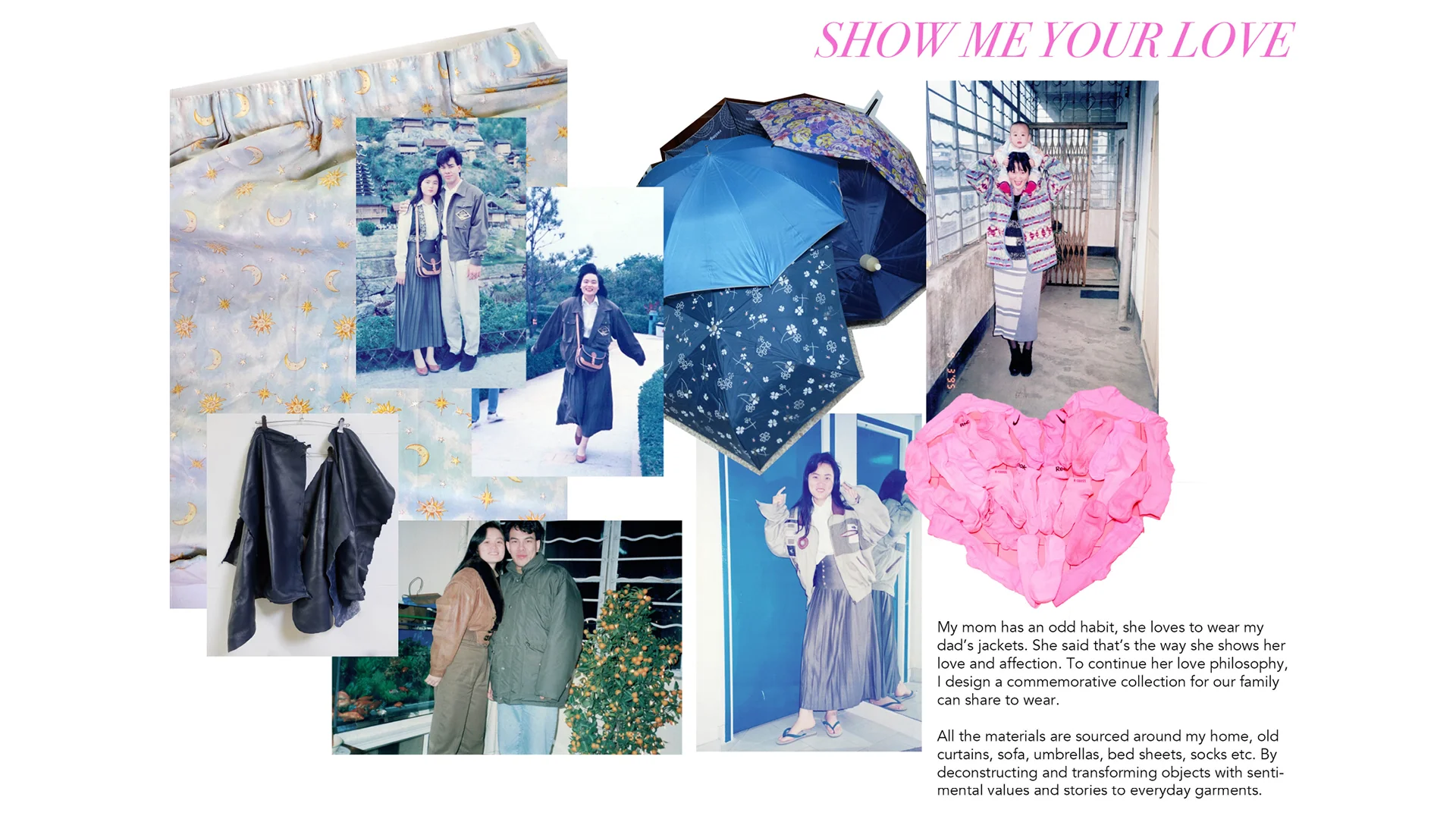 Jesse’s submission for the Redress Design Award was inspired by his mother’s love of wearing his father’s old jackets as a way of showing her love and affection. Jesse up-cycled and reconstructed textiles found in his family home, including old curtains, sofa fabrics, umbrellas, bed sheets and socks, transforming objects with sentimental value and memories into a timeless collection that can be shared.
