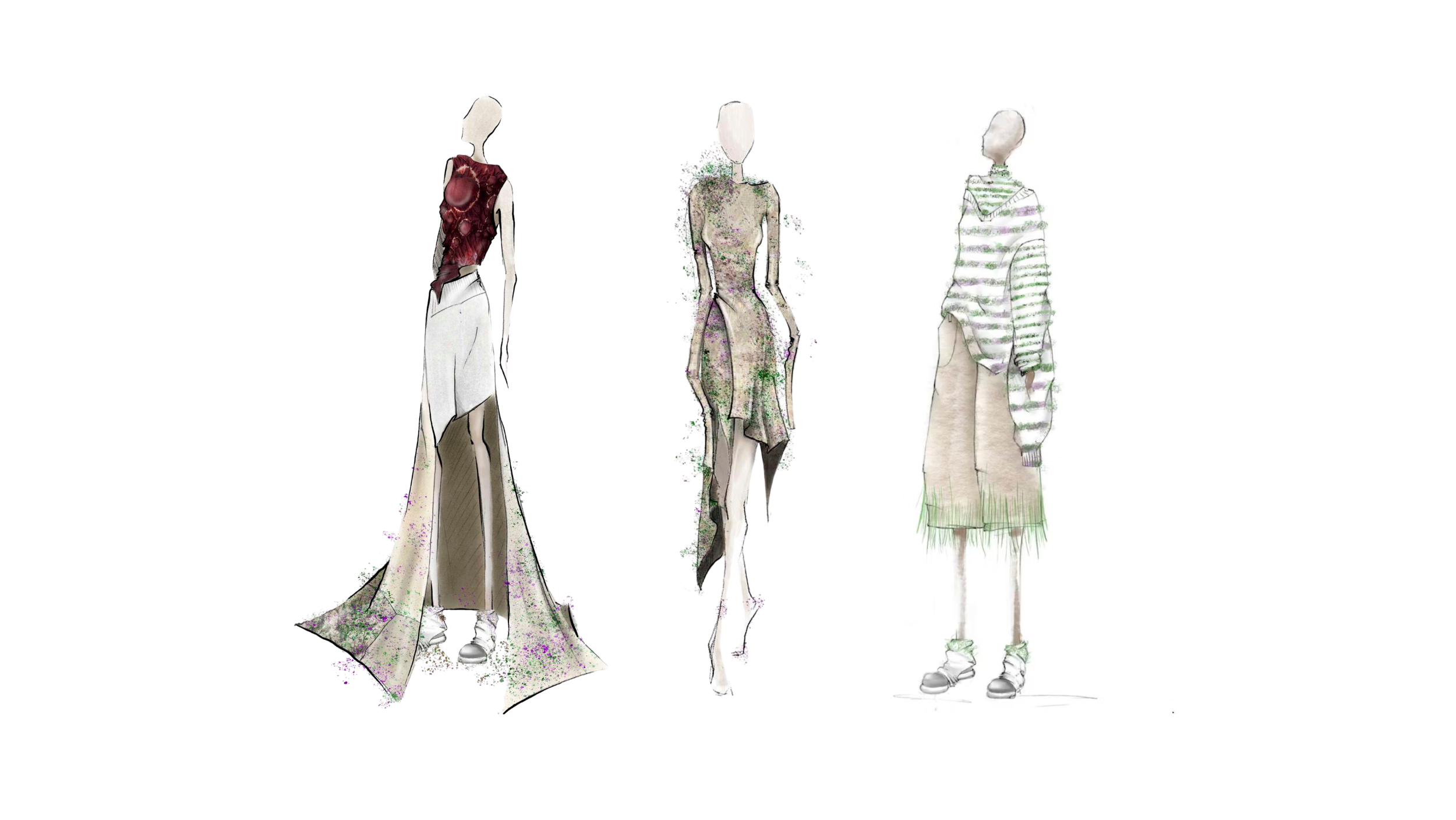 Lou’s Redress Design Award collection, ‘Emancipation’, is inspired by contradictions in society and the desire to wake people up to them. The collection upcycles unsold knitwear garments, pure wool and linen deadstock fabrics, and silk Shibori panels naturally dyed with lac to minimise waste. Designing for low environmental impact, Lou uses the natural tannin reaction of a plant through cooking and compression as a printing technique to create vegetal patterns, also adding leek, coral, red cabbage, and wheat grass seeds to her designs.