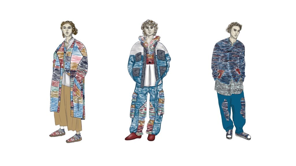At the heart of the ‘Beyond Illusion’ collection are designs that utilise the ancient weaving technique sakiori and the traditional natural indigo dye method combined with modern cuts. I use pineapple yarns made from agricultural waste, discarded fabrics, damaged yarns, and leftover fabric sourced from my previous collection. All ingredients are sourced locally, and I design with monofibre for recyclability. All of this creates practical, fashionable pieces that bring a delicate combination of the old and the new.