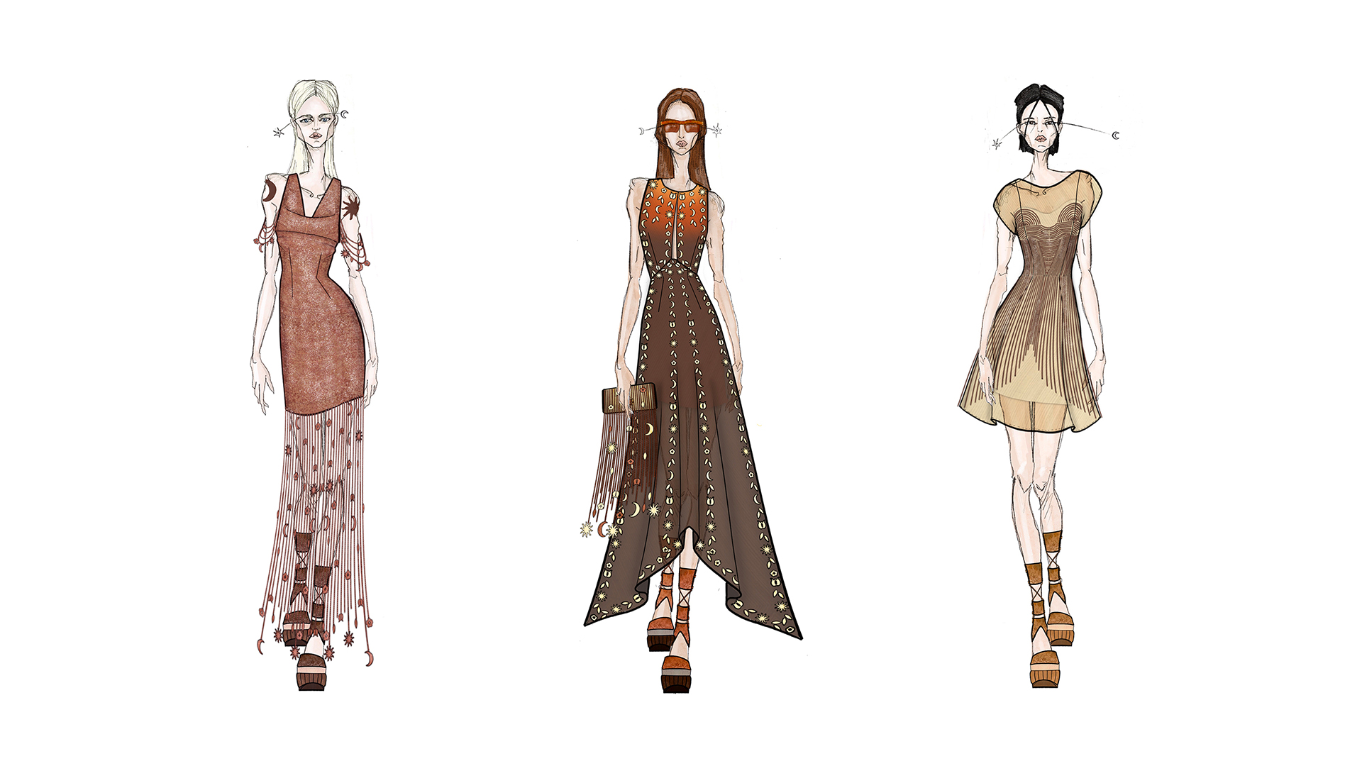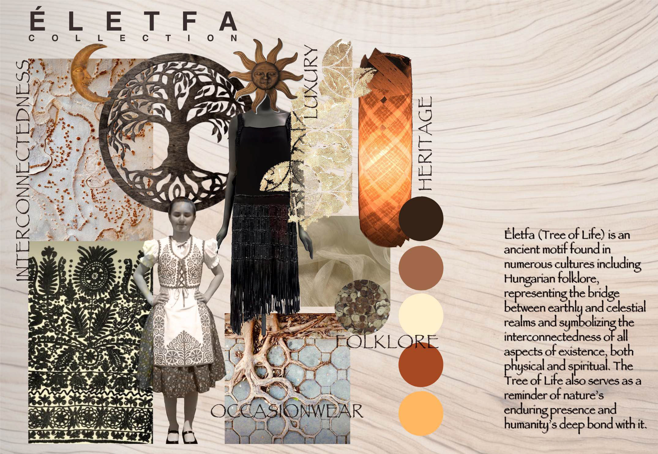 Patrik’s Redress Design Award collection, ‘Életfa’ (Hungarian for ‘Tree of Life’), draws inspiration from Hungarian folklore, where this ancient symbol represents the link between earthly and celestial realms. The collection embraces natural dyes and uses biodegradable byproducts from the food (pineapple or banana silk) and furniture industries (wood shavings), paired with recycled cotton linings, including a detachable lining on a cami dress that can be recycled on its own, and biodegradable fastening, such as wooden buttons. For a subtle, luxurious shimmer, wooden sheets are finished with chemical-free bioplastic, then cut by hand and laser to create decorative sequins.