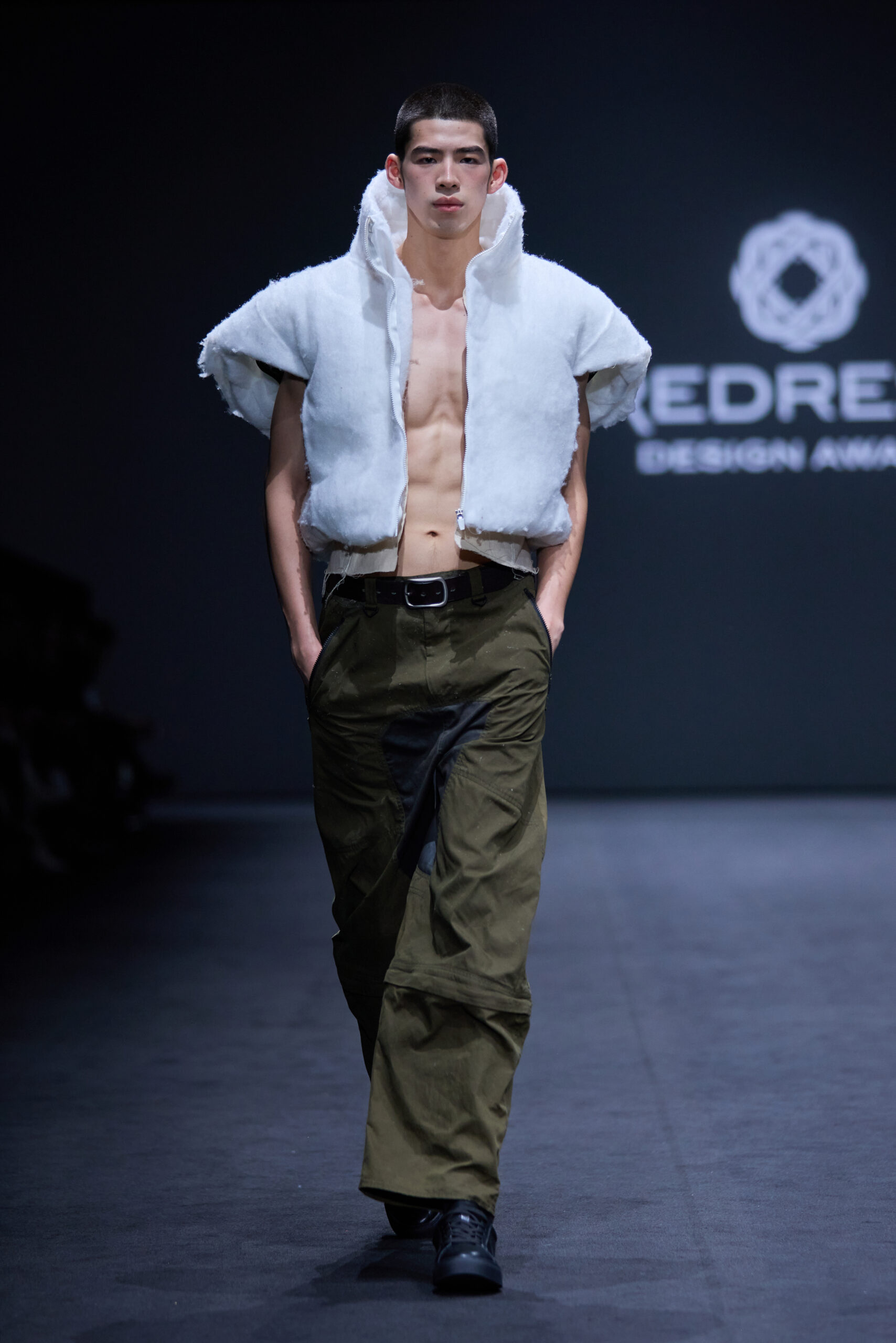 Tiger’s Redress Design Award collection, ‘The Wanderer/無依者’, is a reflection on the wealth disparity in fashion, and is inspired by the unique clothing and lifestyles of ‘street wanderers’. The collection uses upcycled materials including commonly discarded items such as towels and curtains from hotels, felt from airports, car seat covers, and discarded sofas and mattresses, which ensures a stable supply of materials while creating solutions for waste. For patterns, they consider not only aesthetics, which they believe is one of the most important factors for consumers, but also versatility and practicality.
