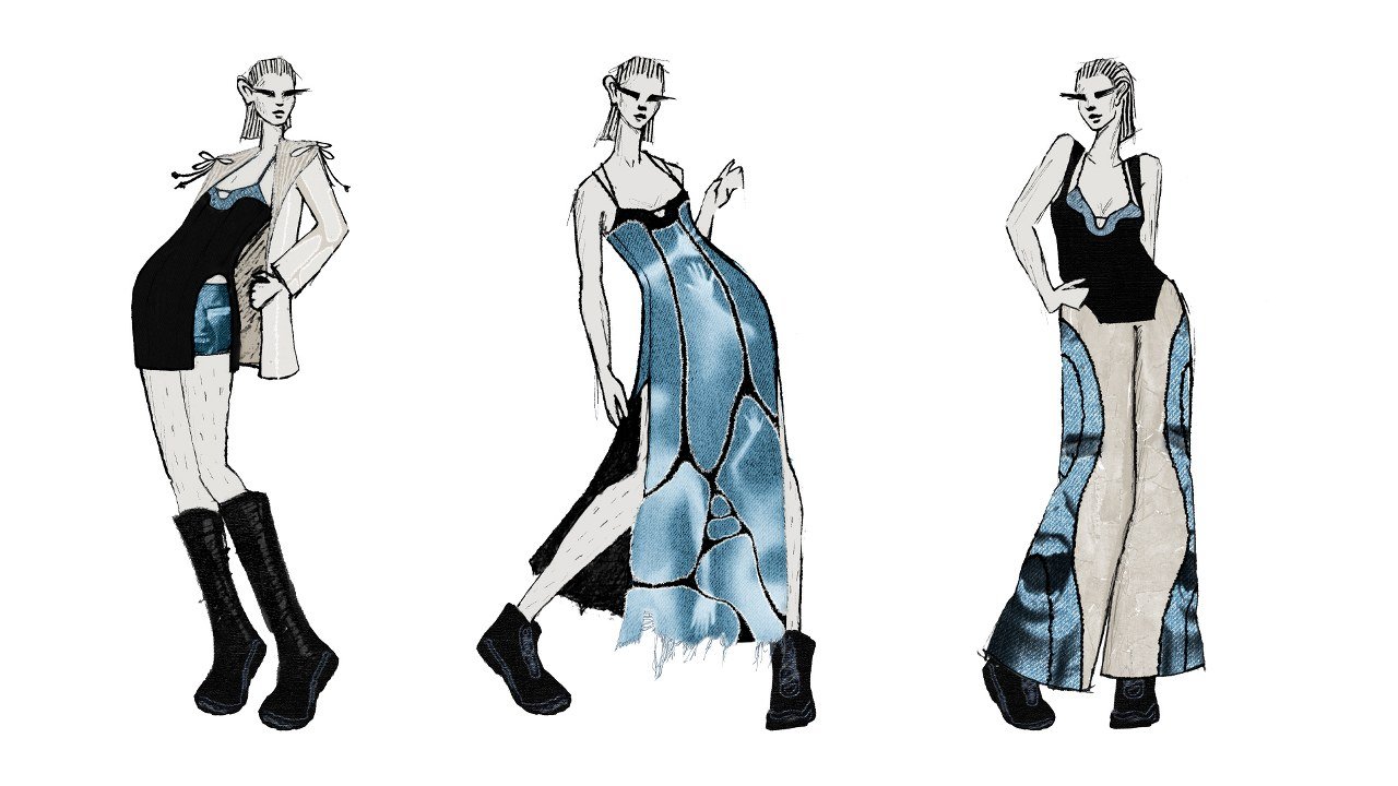 Louise的 “Redress 设计大赛” 系列 “DISSECT”,探索拆解事物、带着玩味的好奇心审视和在尊重原始的基础上重新配置。该系列特色是模块化服装,提供多种穿着方式,并使用由100%天然纤维制成的纺织废料,避免使用合成材料,从而减少微塑料污染。损坏的矿工裤去除品牌标识后重新构造成新款式,同时保留其原有的强大特点及以零浪费而设计的衬衫。所有印花均通过激光数字蚀刻,最大限度地减少染料和能源浪费。