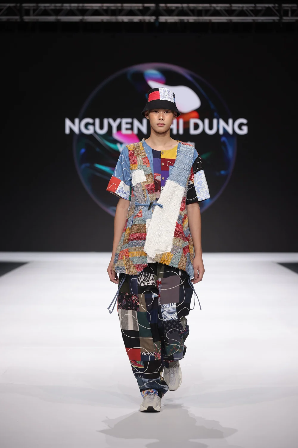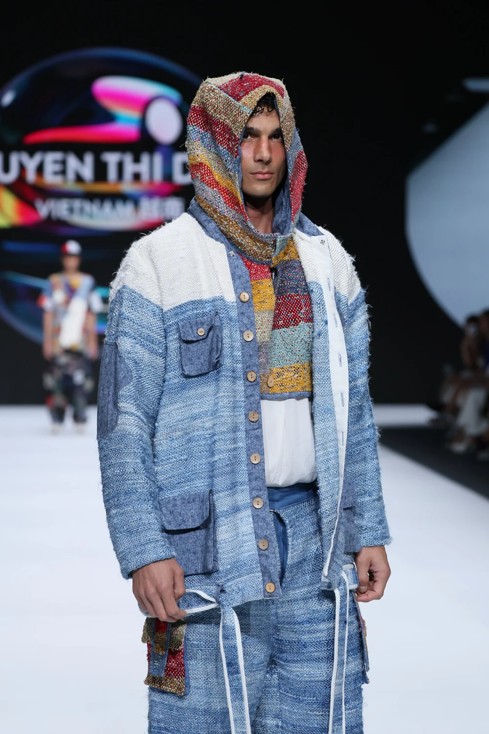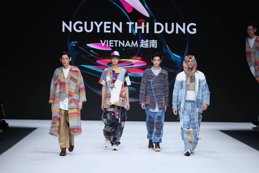 Thi Dung 的 “Redress 设计大赛” 系列,“BEYOND ILLUSION”,灵感来源于幻觉和浪漫主义画作《雾海上的漫游者》(Caspar David Friedrich)。该系列使用自然和当地废料制成,包括来自农业废料的菠萝丝、家用纺织厂的残损纱线以及裁缝店的裁剪亚麻废料。结合日本sakiori手工技巧缝制细节、传统天然靛蓝染色以及现代剪裁,创造出实用、永恒且可调整的设计,包括一件可以变成手提包的背心。