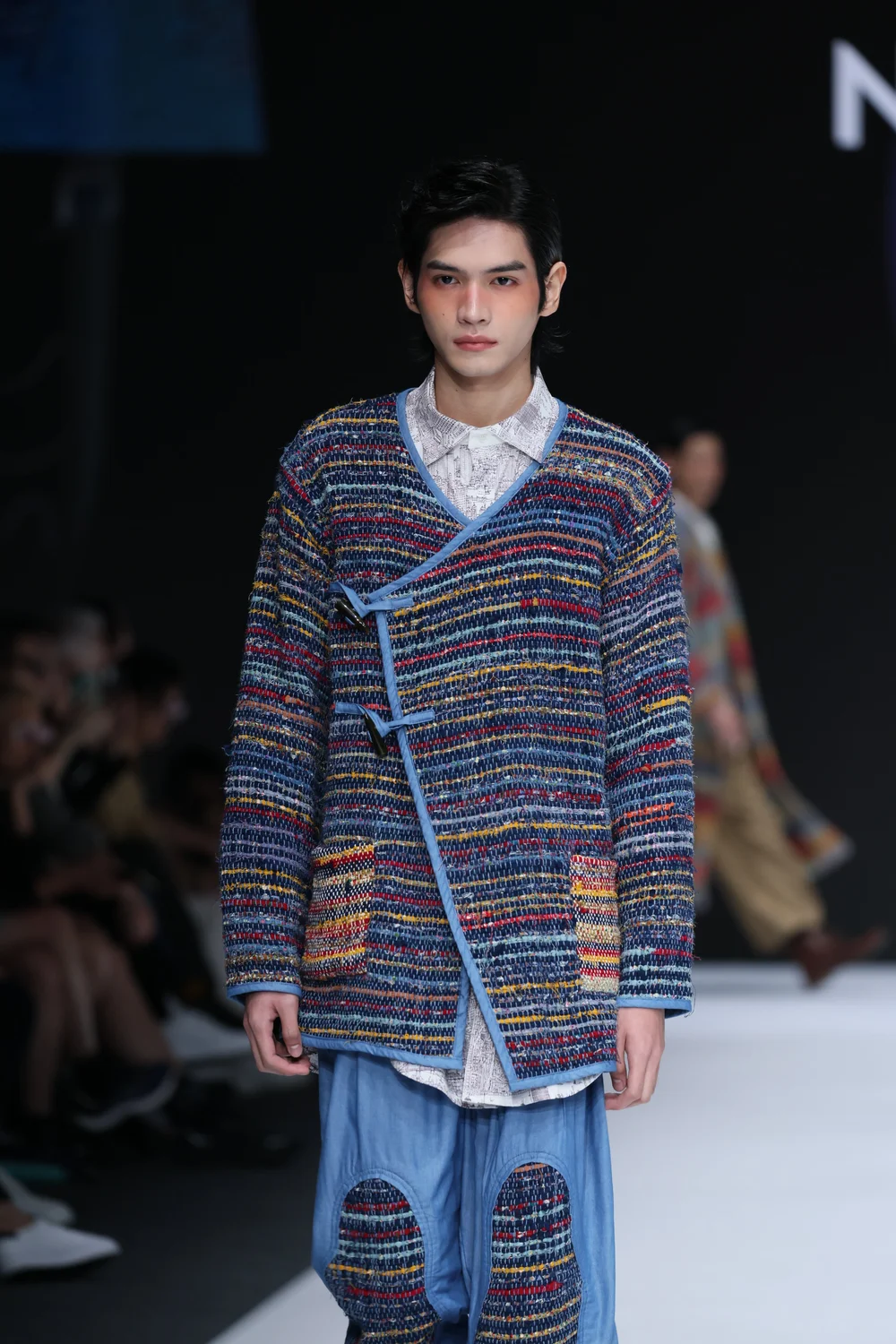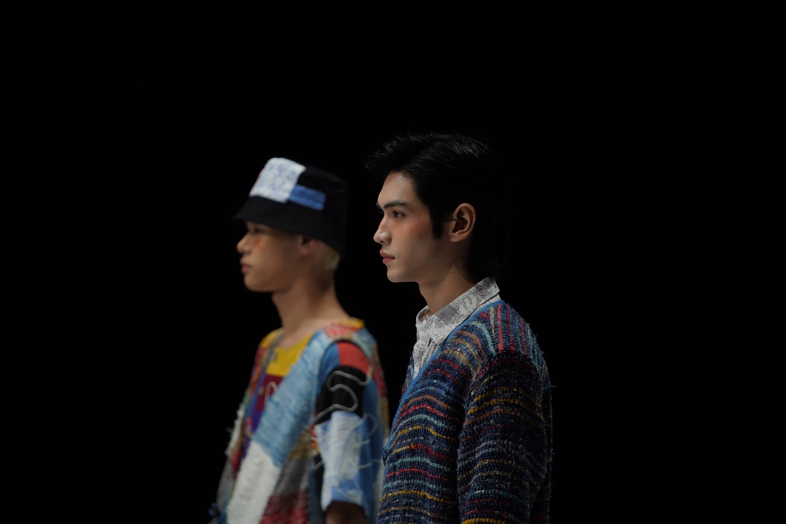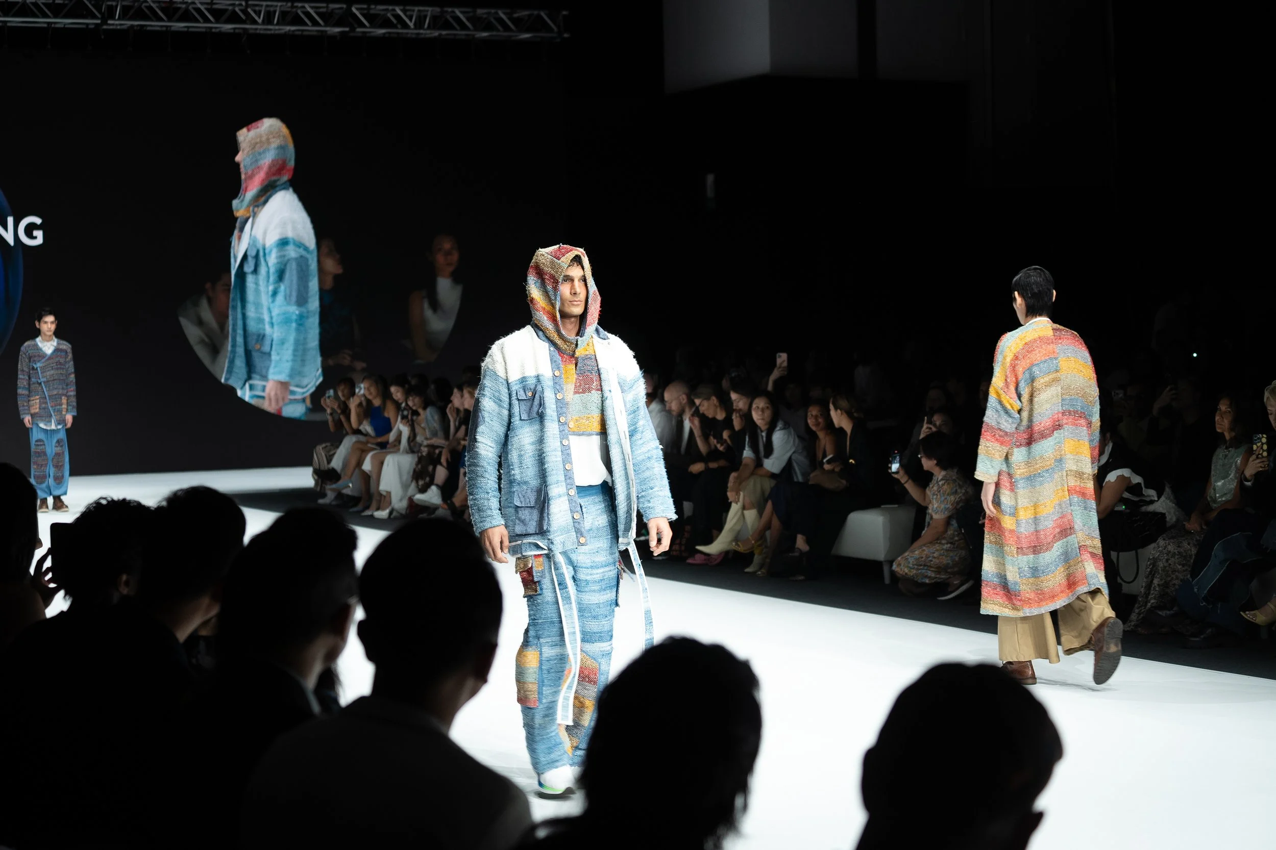 我的「Beyond Illusion」系列融合了古老的裂织技术(sakiori)和传统的天然靛蓝染色方法,搭配现代剪裁。我使用了由农业废料制成的菠萝纱线、废弃的布料、损坏的纱线和我之前系列剩余的布料。所有材料都来自本地,并且我采用了单一纤维设计,便于回收利用。这样的设计结合了古老与现代既实用又时尚。