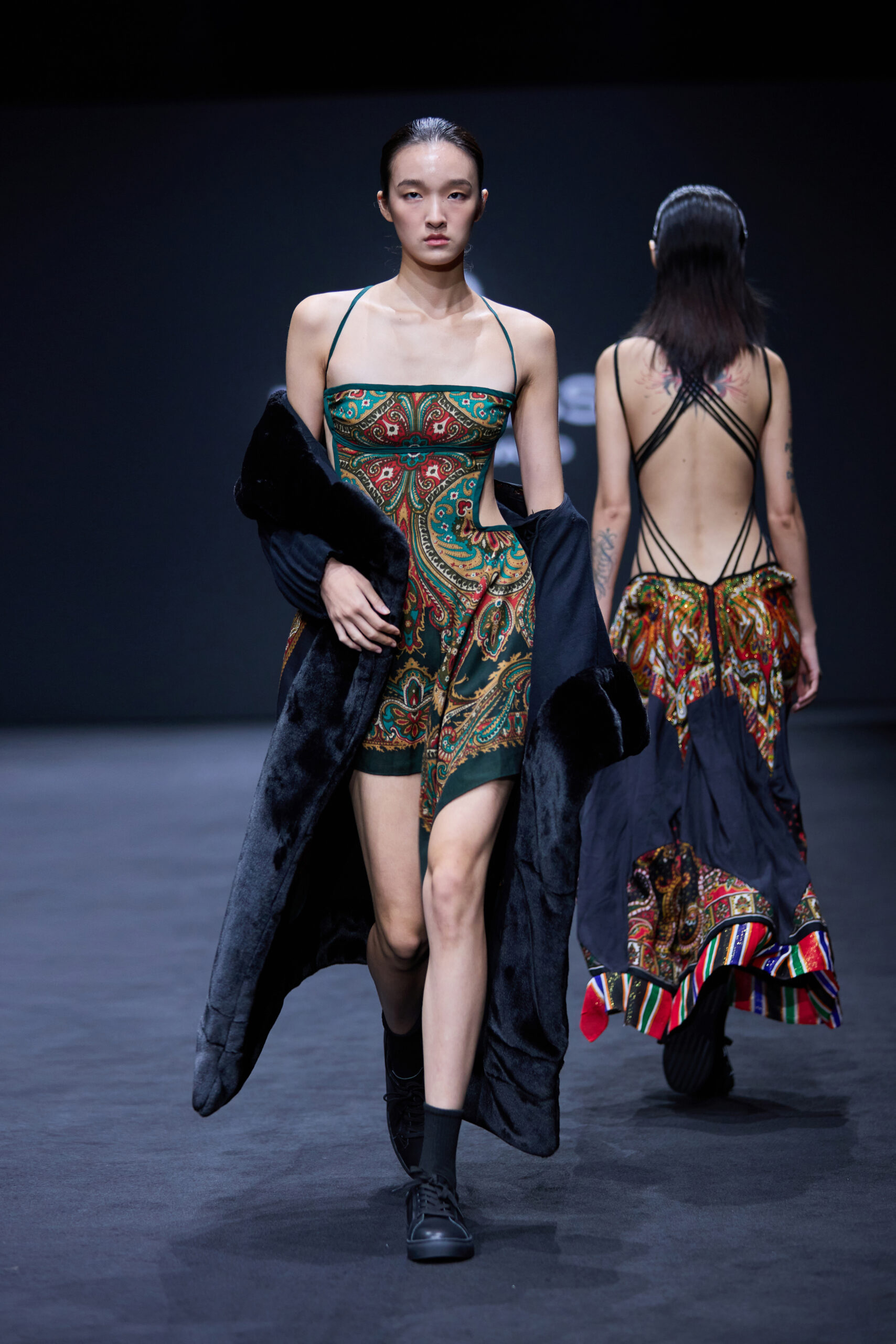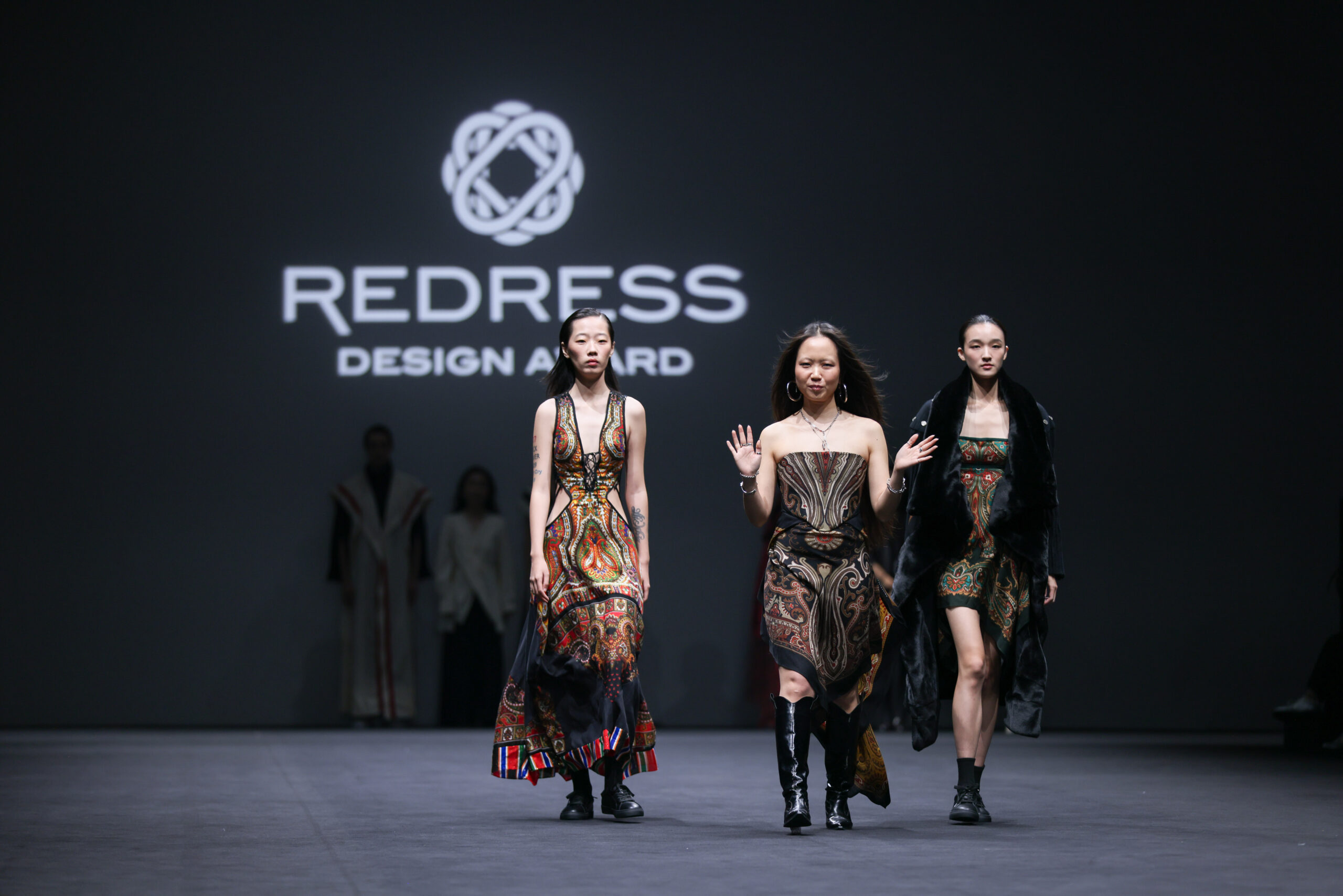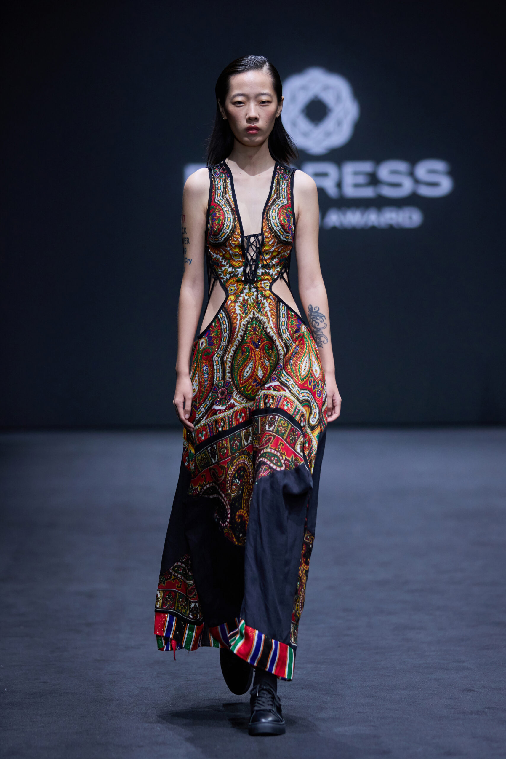 “Redress 设计大赛” 时尚系列 阮喆伊 的 “Redress 设计大赛” 系列 “Odyssey”,以设计师在探索可持续解决方案的旅程命名,这体现在代表 Zoroastrian 中生命与永恒的印花图案上。该系列采用了拼接、毡毯和修补技术及尾货、样品布和未售出的服装废料增添了层次和质感,包括复古丝巾和日本带式腰带。还采用了无废料剪裁制作连衣裙和饰边,并使用染色亚麻餐巾制作了袖子。