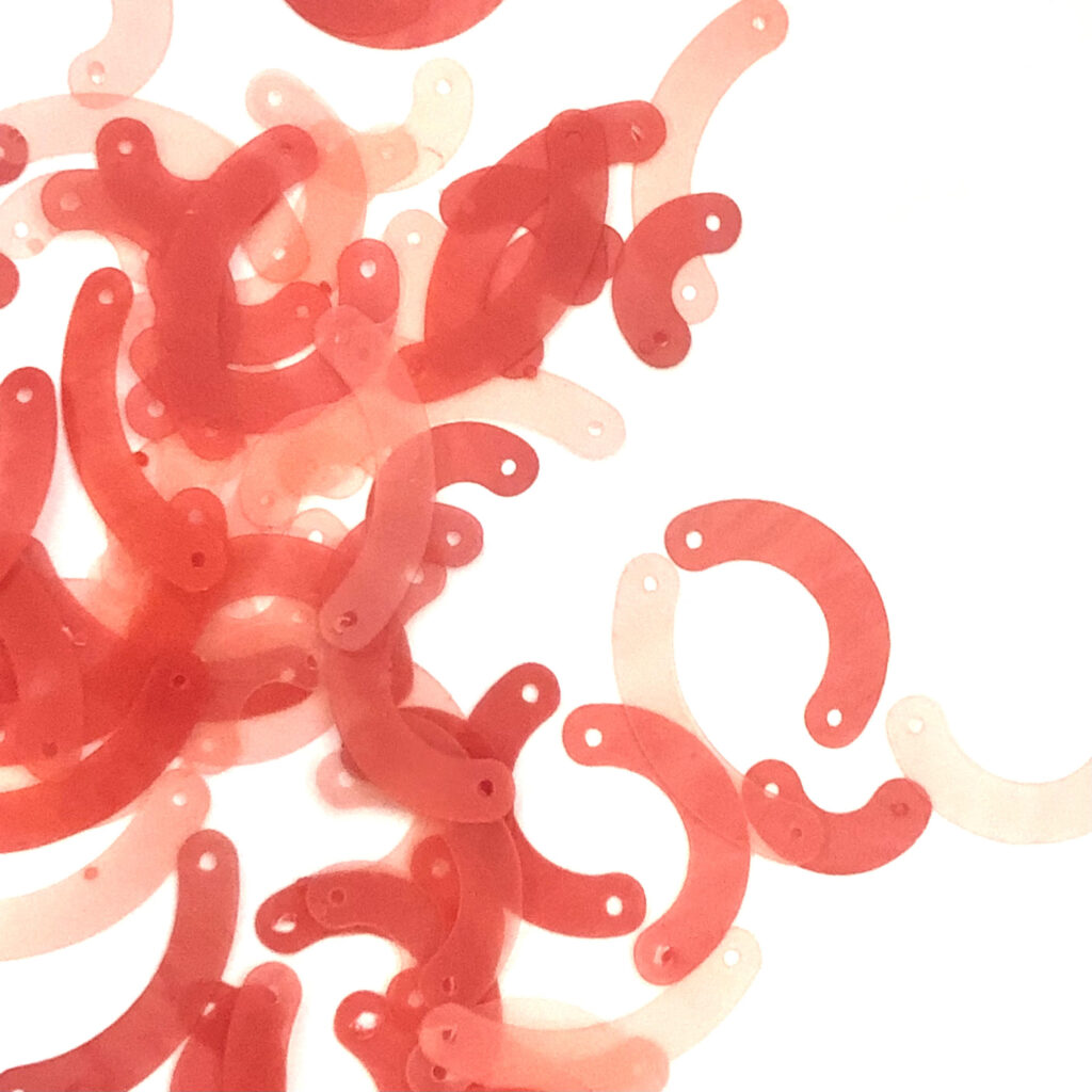 在創造生物基可堆肥珠片的過程中遇到了許多挑戰,我尚未解決所有問題!其中一個挑戰是平衡可洗性和生物降解性,這一點我在利茲大學、布拉德福德大學和皇家藝術學院的支持下已經克服。現在,我正在申請資金,以便為珠片添加可持續的顏色和效果。