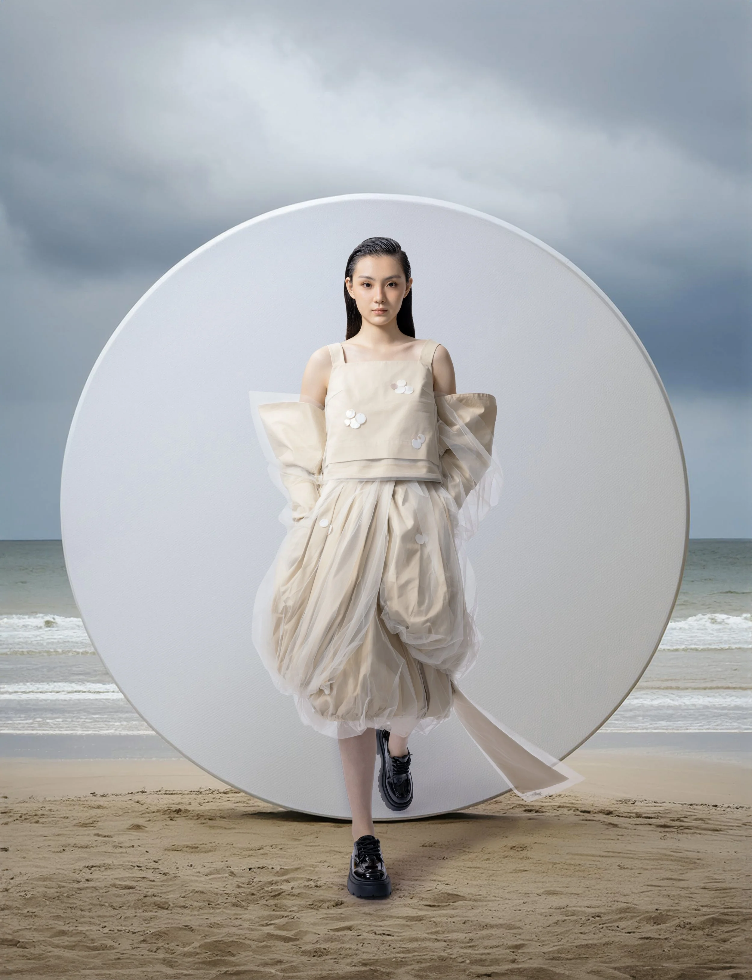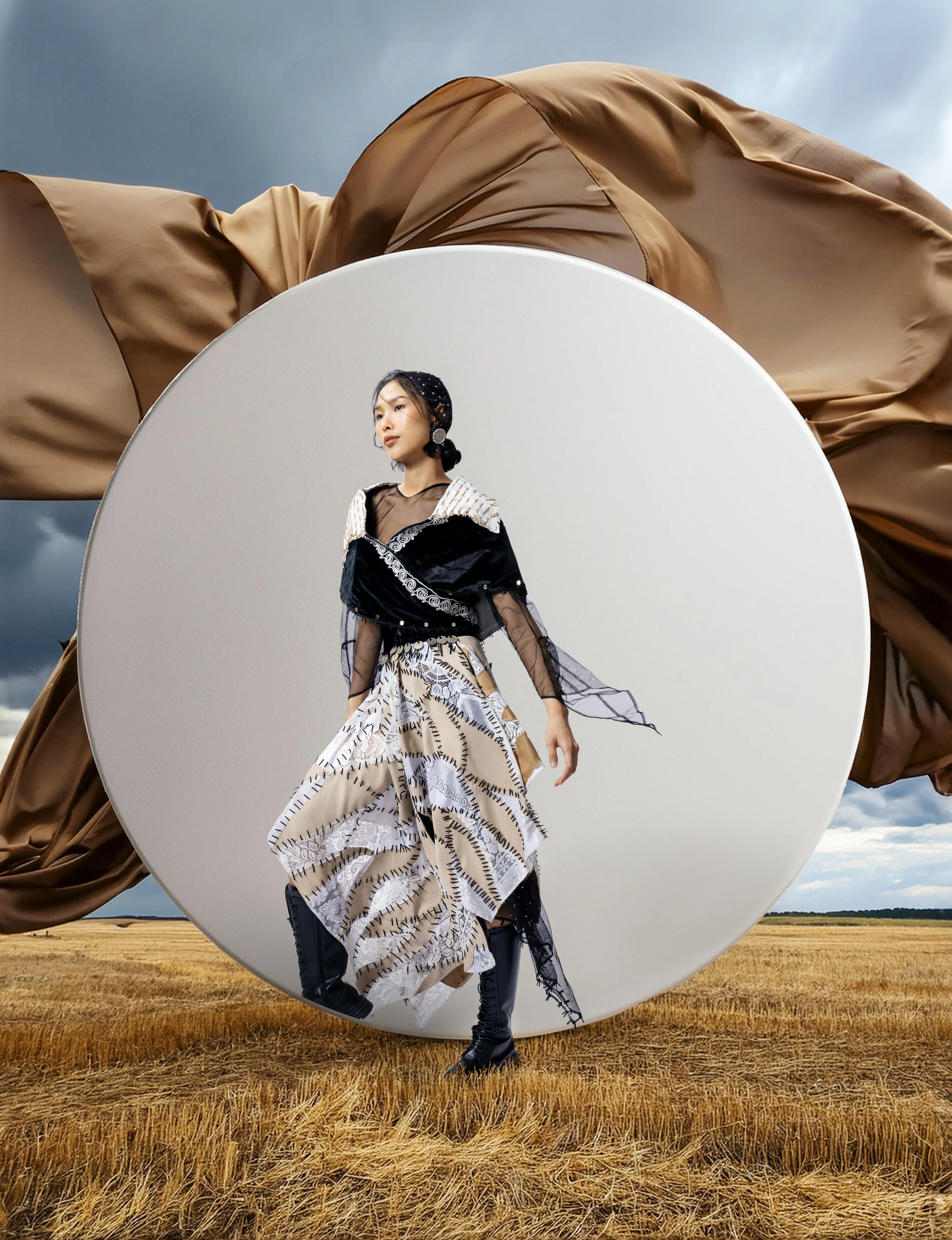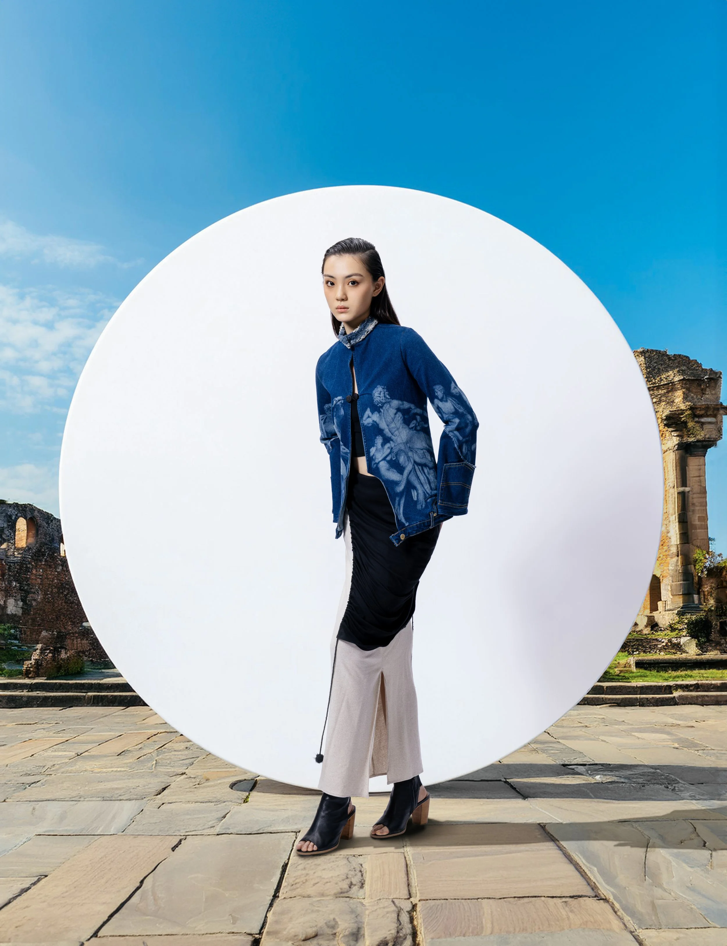 The circular aesthetics displayed in the photoshoot pay tribute to the role of circularity in driving fashion towards a more sustainable future.